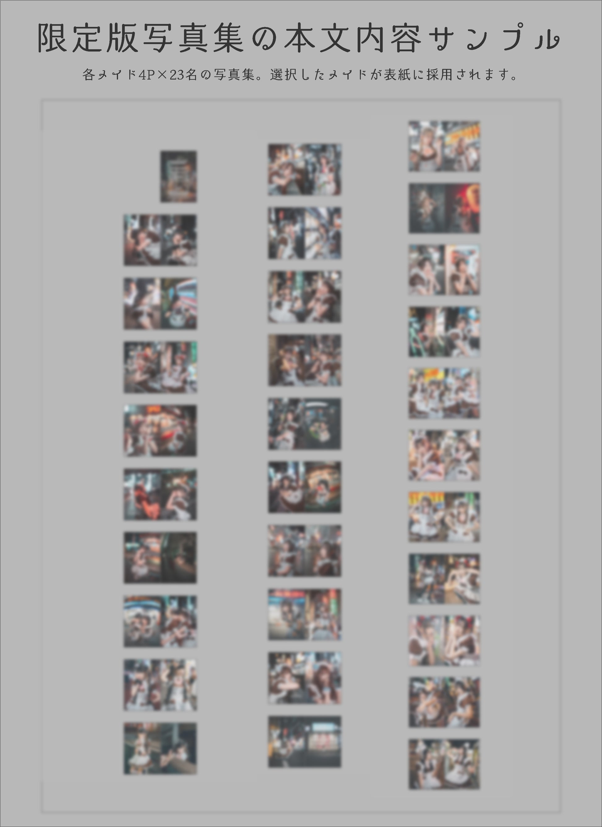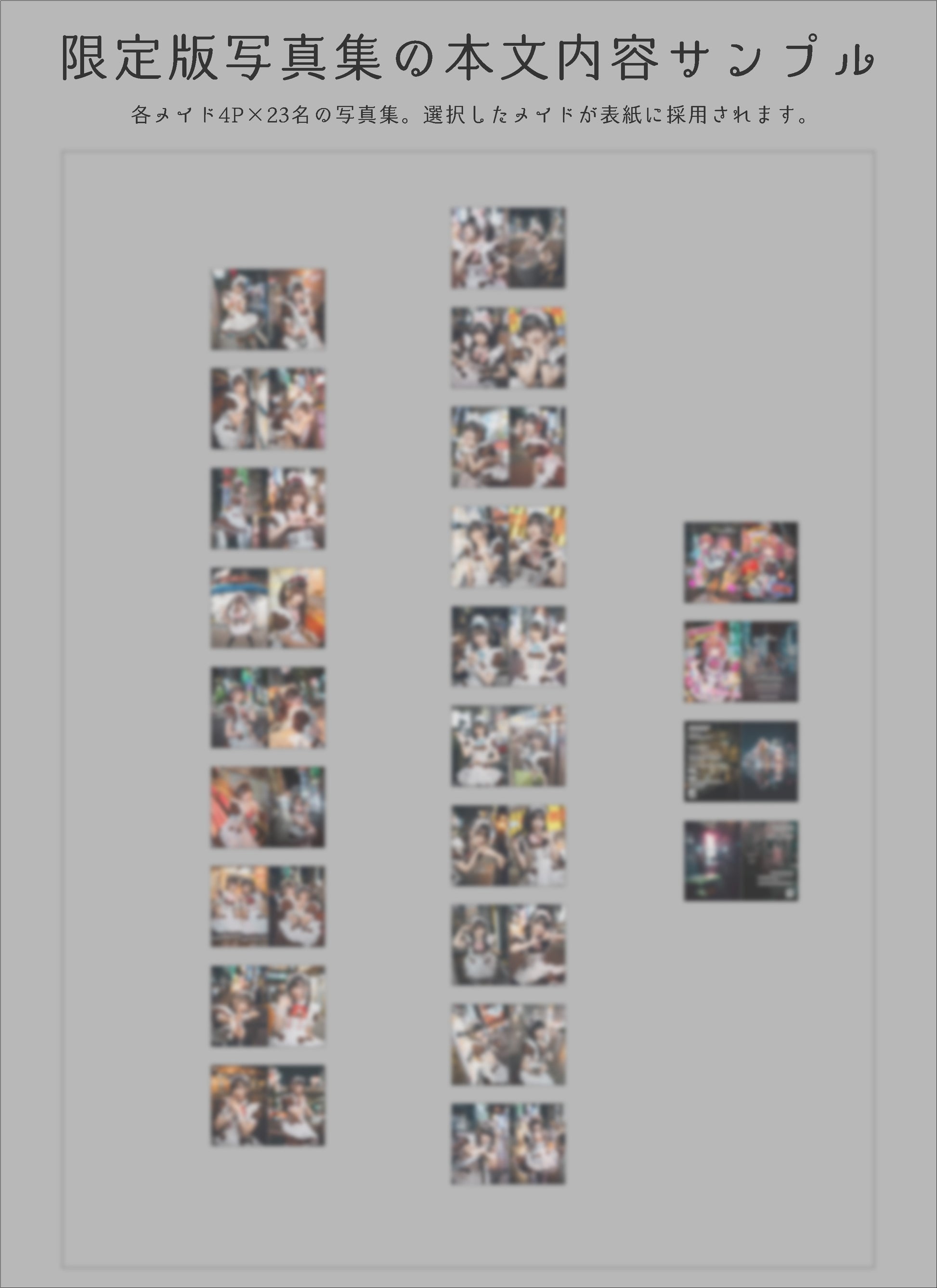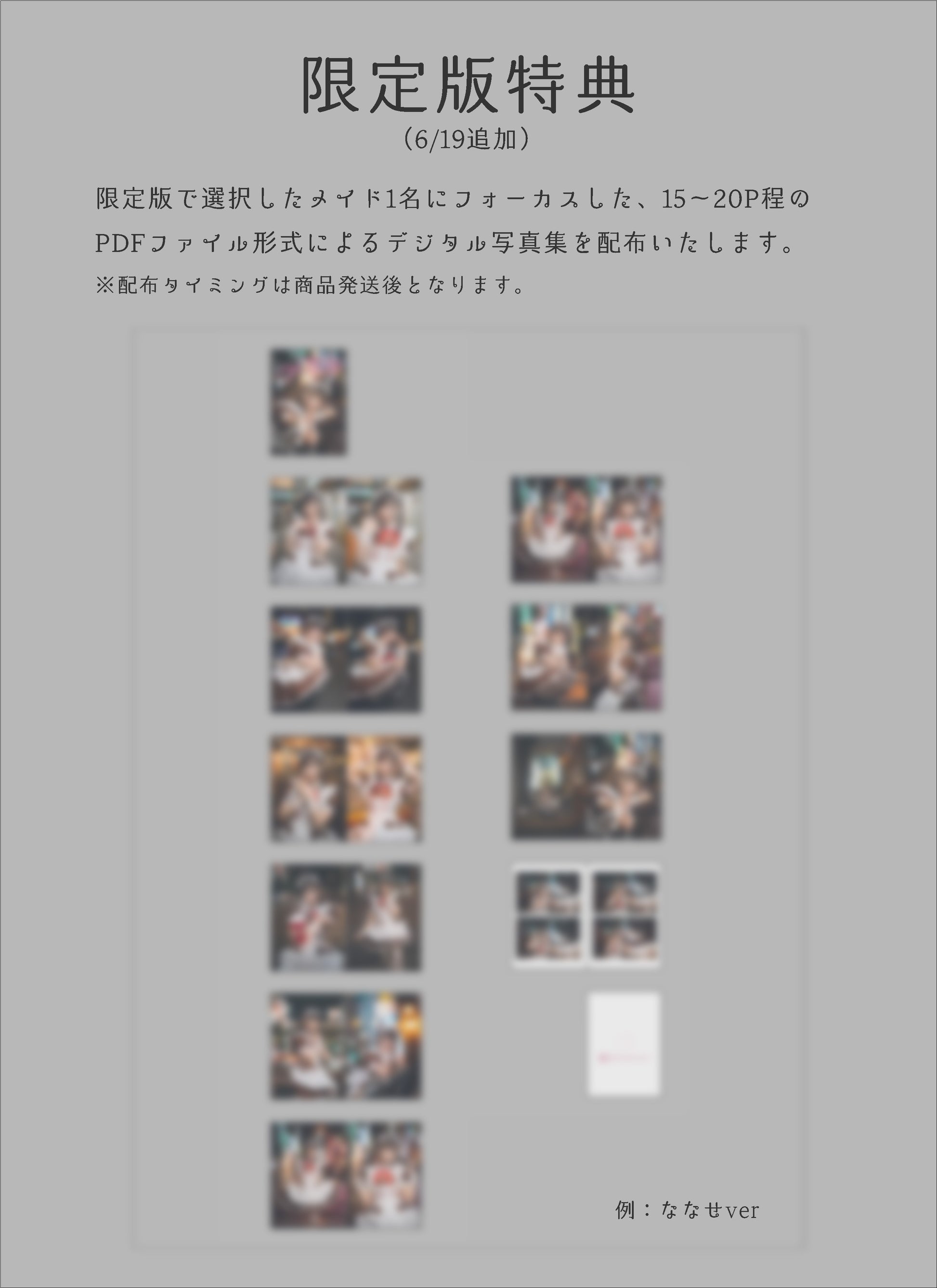 限定版で選択したメイド1名にフォーカスした、15〜20P程のPDFファイル形式によるデジタル 写真集を配布いたします。 ※配布タイミングは商品発送後となります。